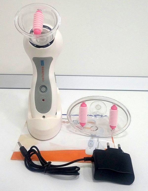 Портативний антицелюлітний масажер для тіла Целлюлес МД ефектівен за рахунок потрійного дії (вакуум, масаж, інфрачервоне випромінювання). В комплект входять вакуумні насадки: маленька з одним роликом і велика з двома роликами. Ці масажні ролики здійснюють масаж проникаючи в глибокі шари шкіри, цим самим стимулюючи вироблення колагену, покращує обмін речовин і розщеплює целюліт.